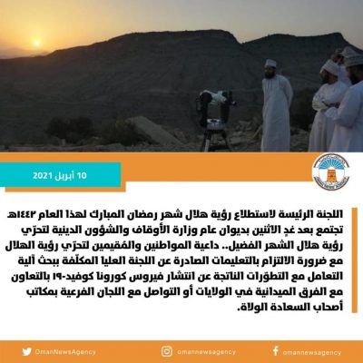 وهج الخليج- مسقط اللجنة الرئيسة لاستطلاع رؤية هلال شهر رمضان المبارك لهذا العام ١٤٤٢هـ تجتمع بعد غدٍ الاثنين بديوان عام وزارة الأوقاف والشؤون الدينية لتحرّي رؤية هلال الشهر الفضيل.