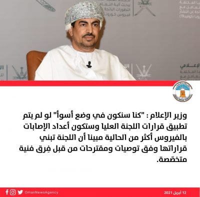 قال معالي الدكتور عبدالله بن ناصر الحراصي وزير الإعلام ،خلال اللقاء الإعلامي أن سنكون في وضع اسواء و ستكون اعداد الاصابات بالفيروس أكثر من الحالية لو لم يتم تطبيق قرارات اللجنه العليا