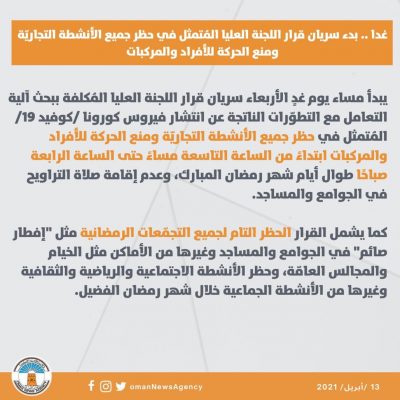 يبدأ مساء غد الأربعاء سريان قرار اللجنة العليا المُتمثل في حظر جميع الأنشطة التجاريّة ومنع الحركة للأفراد والمركبات ابتداً من الساعة التاسعة مساءً حتى الساعة الرابعة صباحاً.
