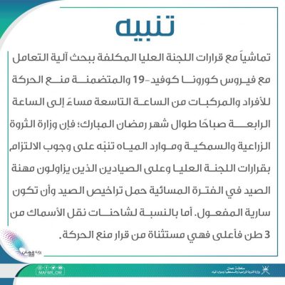 أصدرت وزارة الثروة الزراعية و السمكية و موارد المياة تنبيه للصيادين وناقلي الثروة المائية الحية.