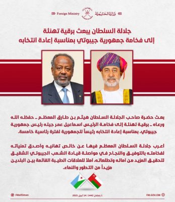 حضرة صاحب الجلالة السلطان المعظـم ــ حفظه الله ورعاه ــ يبعث برقية تهنئة إلى فخامـة الرئيس اسماعيل عمر جيله رئيس جمهورية جيبوتي، بمناسبة إعادة انتخابه رئيساً للجمهورية لفترة رئاسية خامسة.