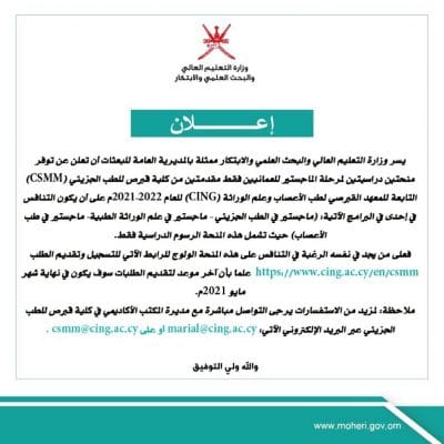 يسر وزارة التعليم العالي والبحث العالمي عن توفر منحتين دراسيتين لمرحلة الماجستير للعمانيين فقط مقدمتين من كلية قبرص للطب الجزيئي(CSMM) التابعة للمعهد القبرصي لطب الأعصاب وعلم الوراثة (CING) للعام 2020– 2021 .
