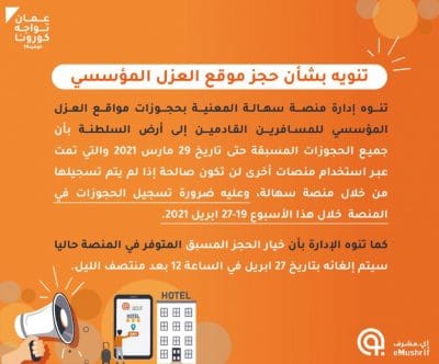 وهج الخليج- مسقط نشر حساب " عمان تواجه كورونا" اليوم عبر حسابه الرسمي في تويتر تنبيهًا حول حجز موقع العزل المؤسسي عبر منصة “سهالة”