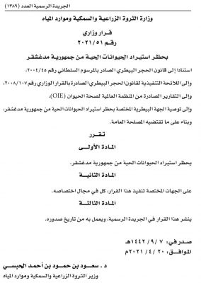 أصدر وزير الثروة الزراعية والسمكية وموارد المياه، معالي الدكتور سعود بن حمود بن أحمد الحبسي القرار الوزاري رقم ٥١ / ٢٠٢١ بحظر استيراد الحيوانات الحية من جمهورية مدغشقر