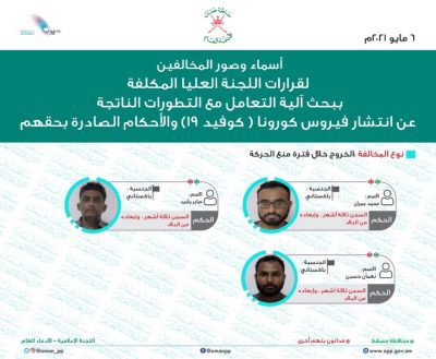 أدانت محكمة ابتدائية بمحافظة مسقط ثلاثة مخالفين لقرارات ⁧‫اللجنة_العليا‬⁩؛ لخروجهم خلال فترة منع الحركة، وصدرت بحقهم أحكام بالسجن ثلاثة أشهر والإبعاد من البلاد.