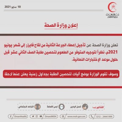 أعلنت وزارة الصحة مسقط عن تأجيل إعطاء الجرعة الثانية من لقاح فايزر إلى شهر يونيو ٢٠٢١م، نظراً لتوجيه المتوفر من الطعوم لتحصين طلبة الصف الثاني عشر قبل حلول موعد الإختبارات النهائية.