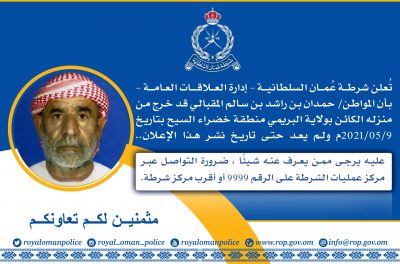 وهج الخليج-مسقط إعلان بخروج مواطن من منزله بمنطقة خضراء السيح بولاية البريمي ولمن يعثر عليه أو لديه بيانات عن مكان تواجده التواصل مع أقرب مركز شرطة أو على الرقم 9999.
