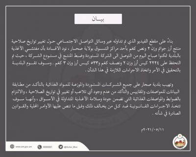 تابعت بلدية_صحار المقطع المتداول عبر وسائل التواصل الاجتماعي حول تغيير تواريخ صلاحية منتج أرز بأحد مراكز التسوق بالولاية حيث تمكن مفتشي الأغذية بالبلدية من التوصل إلى الشركة المستوردة وضبط المنتج في مستودع الشركة..تفاصيل ذلك من خلال هذا البيان. 👇