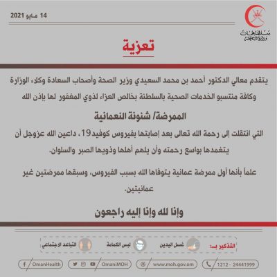 وهج الخليج- مسقط أعلنت وزارة الصحة اليوم عبر حسابها الرسمي في تويتر عن تسجيل أول وفاة لممرضة عمانية بسبب فيروس كورونا كوفيد-19