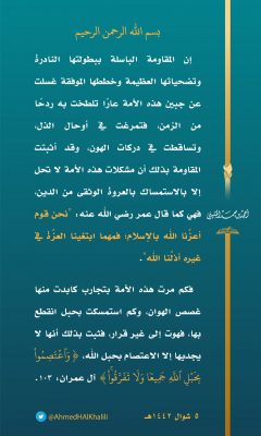 سماحة الشيخ أحمد الخليلي عبر حسابه الرسمي في تويتر : إن المقاومة الباسلة ببطولتها النادرة وتضحياتها العظيمة وخططها الموفقة غسلت عن جبين هذه الأمة عارًا تلطخت به ردحًا من الزمن، فتمرغت في أوحال الذل، وتساقطت في دركات الهون، وقد أثبتت المقاومة بذلك أن مشكلات هذه الأمة لا تحل إلا بالاستمساك بالعروة الوثقى من الدين.