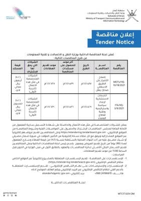 أعلنت لجنة المناقصات الداخلية بوزارة النقل والاتصالات وتقنية المعلومات عن طرح مناقصتين داخليتين: