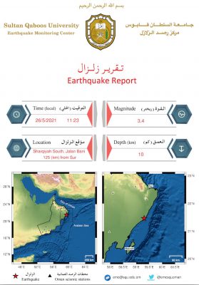 وهج الخليج-مسقط زلزال بقوة٣٫٤ في صدع مصيرة س ١١:٢٣ ص بالتوقيت المحلي.