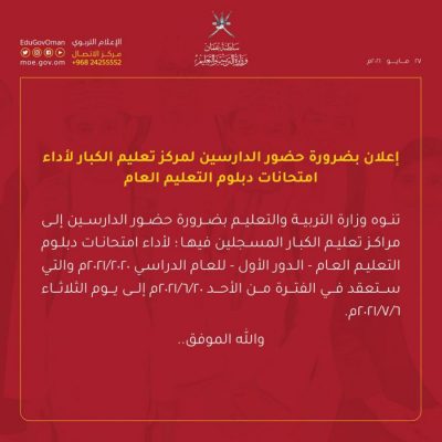 وهج الخليج- مسقط أعلنت وزارة التربية والتعليم بضرور حضور الدارسين لمركز تعليم الكبار لأداء امتحانات دبلوم التعليم العام.