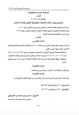 وهج الخليج- مسقط أصدر معالي الفريق حسن بن محسن الشريقي المفتش العام للشرطة والجمارك قرارًا بتعديل بعض أحكما اللائحة التنفيذية لقانون إقامة الأجانب وجاء نص القرار كالآتي: