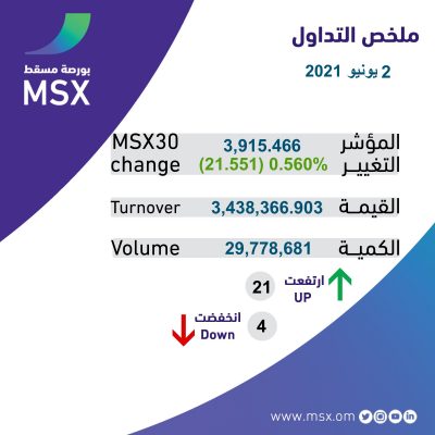 شهدت بورصة مسقط اليوم ارتفاعًا بلغ (6ر21) نقطة لتغلق على (47ر3915) نقطة وبلغت قيمة التداول (3) ملايين و(438) ألفًا و(367) ريالًا عُمانيًّا.