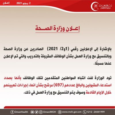 تود وزارة الصحة أن تلفت انتباه المواطنين الكرام بأنها بصدد استدعاء المقبولين للوظائف المقرونة بالتدريب والبالغ عددهم (697) مرشح بشأن انهاء إجراءات تعيينهم خلال الأيام القادمة وسوف يتم التنسيق مع وزارة العمل بخصوص ذلك.