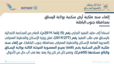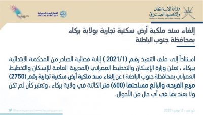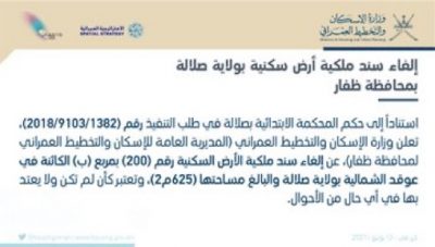 وهج الخليج- مسقط أعلنت وزارة الإسكان والتخطيط العمراني عن إلغاء سند ملكية لعدد من الأراضي السكنية والتجارية في مختلف ولايات السلطنة.
