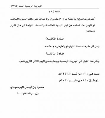 المادة (9)”تفرض غرامة إدارية مقدارها (20) عشرون ريالا عمانيا على مالك الحيوان السائب أو المهمل عند تسلمه من قبل البلدية المختصة، وتضاعف الغرامة في حال تكرار المخالفة”.