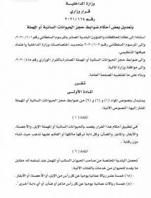أصدر معالي السيد حمود بن فيصل البوسعيدي قرارا وزاريا رقم 164 / 2021 بتعديل بعض أحكام ضوابط حجز الحيوانات السائبة أو المهملة، وجاء فيه: استنادا إلى نظام المحافظات والشؤون البلدية الصادر بالمرسوم السلطاني رقم 101 / 2020، وإلى المرسوم السلطاني رقم 102 / 2020 بتحديد اختصاصات وزارة الداخلية واعتماد هيكلها التنظيمي، وإلى ضوابط حجز الحيوانات السائبة أو المهملة الصادرة بالقرار الوزاري رقم 485 / 2020، وإلى موافقة وزارة المالية، تقرر: