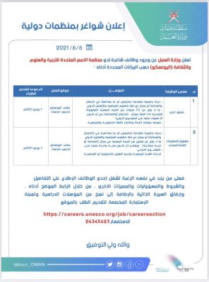 تعلن وزارة العمل عن وجود وظائف شاغرة لدى منظمة الأمم المتحدة للتربية والعلوم والثقافة (اليونسكو)، وبإمكان الاطلاع على التفاصيل والشروط من خلال الرابط التالي: