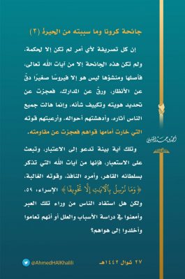 حساب سماحة الشيخ أحمد بن حمد الخليلي المفتي العام للسلطنة : “إن كل تصريفة لأي أمر لم تكن إلا لحكمة ولم تكن هذه الجائحة إلا من آيات الله، فأصلها ومنشؤها ليس هو إلا فيروسًا صغيرًا دقّ عن الأنظار ورقّ عن المدارك فعجزت عن تحديد هويته وتكييف شأنه وإنما هالت جميع الناس آثاره وأدهشتهم أحواله وأرعبتهم قوته التي خارت أمامها قواهم فعجزت عن مقاومته”.