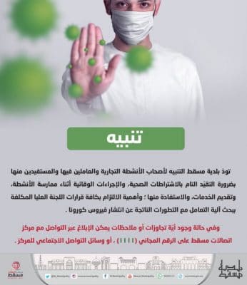 أصدرت بلدية مسقط عبر حسابها الرسمي علو تويتر تنويها لجميع أصحاب الأنشطة التجارية والعاملين والمستفيدين بضرورة التقيّد التام بالاشتراطات الصحية، والإجراءات الاحترازية الوقائية، والالتزام بكافة قرارات اللجنة العليا، وذلك حرصا على الوقاية اللازمة، وتجنبًا لأية عقوبات ومخالفات.
