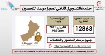 قالت وزارة الصحة أن اجمالي المسجلين في خدمة التسجيل الذاتي لحجز موعد التحصين في جميع مراكز التحصين في مختلف محافظات السلطنة بلغ 12863 شخصًا خلال يوم واحد.