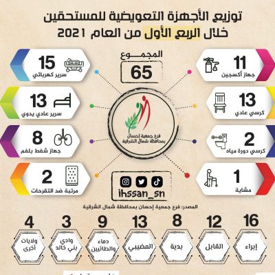 بلغ عدد أجهزة الأوكسجين التي سلمت للمرضى عبر جمعية إحسان 65 جهاز أوكسجين و 182 سريرا كهربائيا و197 كرسيا متحركا عاديا و31 جهاز شفط بلغم ، إضافة إلى عدد من المستلزمات والاحتياجات الطبية.