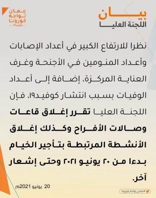 اللجنة العليا تقرر إغلاق قاعات وصالات الأفراح وكذلك إغلاق الأنشطة المرتبطة بتأجير الخيام بدءا من ٢٠ يونيو ٢٠٢١ وحتى إشعار آخر.
