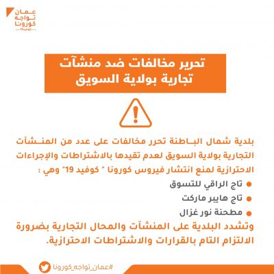 بلدية شمال الباطنة تحرر مخالفات ضد منشآت تجارية بولاية السويق لعدم التزامها بقرارات اللجنة العليا المكلفة ببحث آلية التعامل مع التطورات الناتجة عن انتشار فيروس كورونا