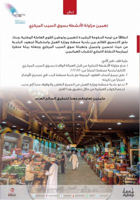 قررت بلدية مسقط في إعلان لها عددا من القرارت منها : منع مزاولة الأنشطة التجارية من قبل العمالة الوافدة بسوق السيب المركزي (التابع لبلدية مسقط) اعتبارا من 1 يناير 2022، وعلى جميع أصحاب العقود المبرمة مع بلدية مسقط البدء في تصحيح الأوضاع اعتبارا من تاريخه.