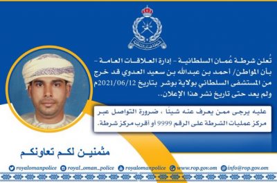 وهج الخليج- مسقط أعلنت شرطة عمان السلطانية عن خروج مواطن من المستشفى ولمن يجده أو لديه معلومات عن مكان تواجده إبلاغ أقرب مركز شرطة أو الاتصال بمركز عمليات الشرطة ٩٩٩٩.