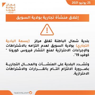بلدية شمال الباطنة تغلق منشأة تجارية بولاية السويق لعدم التزامها بالاشتراطات والإجراءات الاحترازية لمنع انتشار فيروس كورونا.