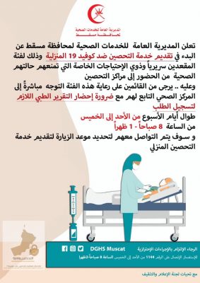 أعلنت صحية مسقط أن تعلن عن بدء خدمة التحصين ضد كوفيد١٩ المنزلية لفئة المقعدين سريريا وذوي الإحتياجات الخاصة وذلك بالتوجه مباشرة إلى المركز الصحي التابع لهم لتسجيل الطلب خلال أيام الأسبوع من الأحد وحتى الخميس