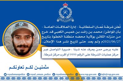 وهج الخليج-مسقط إعلان عن خروج مواطن من منزله بولاية محضة ولمن يجده أو لديه معلومات عن مكان تواجده إبلاغ أقرب مركز شرطة أو الاتصال بمركز عمليات الشرطة على الرقم ٩٩٩٩.