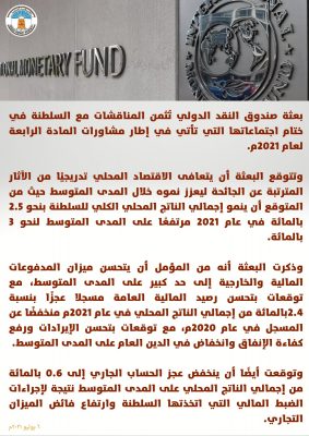 وهج الخليج-مسقط بعثة صندوق النقد الدولي تثمن المناقشات مع السلطنة في ختام اجتماعاتها حول مشاورات المادة الرابعة.