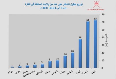 نشرت وزارة الثروة الزراعية والسمكية وموارد المياة تفاصيل تـوزيـع هطول الأمطار على عدد من ولايات السلطنة خلال الفترة من 4 يوليو إلـى 6 يوليو 2021م.