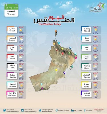 قالت الأرصاد الجوية العمانية أن حالة الطقس اليوم ستكون غائم جزئيًا على الشريط الساحلي لمحافظة ظفار والجبال المجاورة مع فرص لتساقط الرذاذ المتقطع، وصحو بوجه عام على بقية محافظات السلطنة مع فرص تكون السحب الركامية وهطول أمطار متفرقة تمون رعدية وأحياناً مصحوبة برياح نشطة وتساقط لحبات البرد على جبال الحجر والمناطق المجاورة خلال فترة الظهيرة والمساء.