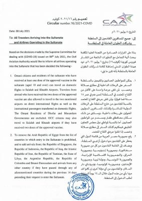 كما يسمح للمواطنين الذين أخذوا جرعة واحدة من اللقاح والقادمين من الخارج اللذين تلقوا جرعتين من السفر على الرحلات الداخلية إلى مطاري صلالة وخصب.