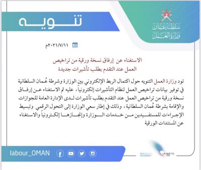 نوهت وزارة العمل بأنه سيتم الاستغناء عن إرفاق نسخة ورقية من تراخيص العمل عند التقدم بطلب تأشيرات جديدة، وذلك في إطار اكتمال الربط الإلكتروني بين الوزارة وشرطة عمان السلطانية في توفير بيانات تراخيص العمل لنظام التأشيرات إلكترونياً.