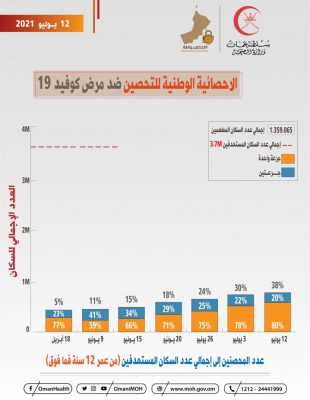 وأوضحت الإحصائية عن إجمالي عدد السكان المطعمين حتى 12 يوليو الجاري 2021 بلغ 1359065 شخص.