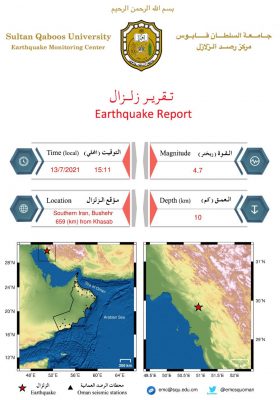 وهج الخليج- مسقط رصد مركز "رصد الزلازل" بجامعة السلطان قابوس زلزال بقوة 4.7 في جنوب ايران 3:11م بالتوقيت المحلي. وذكر المركز أن الزلال يبعد عن ولاية خصب بمحافظة مسندم حوالي 659 كم ، وبعمق 10 كم.