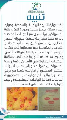 قالت وزارة الثروة الزراعية والسمكية وموارد المياه ، ممثلة بمركز سلامة وجودة الغذاء ، أنها قامت بإتلاف منتج زبدة مصنعة مجهولة المصدر غير صالحة للاستهلاك الآدمي.