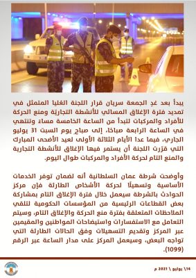 يبدأ بعد غدٍ الجمعة سريان قرار اللجنة العُليا المتمثل في تمديد فترة الإغلاق المسائي، فيما عدا الأيام الثلاثة الأولى لعيد الأضحى المبارك التي قرّرت اللجنة أن يستمر فيها الإغلاق للأنشطة التجارية والمنع التام لحركة الأفراد والمركبات طوال اليوم.