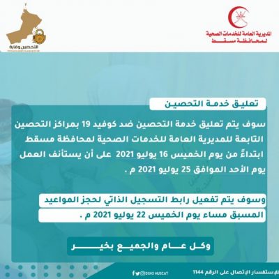 قالت المديرية العامة للخدمات الصحية لمحافظة مسقط بأن خدمة التحصين ضد كوفيد-19 سوف تعلق بمراكز التحصين التابعة للمديرية العامة للخدمات الصحية لمحافظة مسقط.