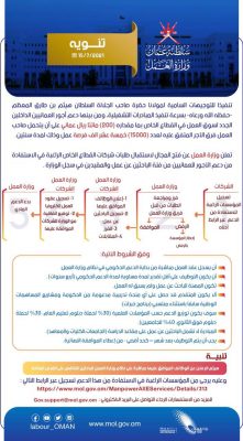 أعلنت وزارة العمل في حسابها الرسمي عبر موقع “تويتر”عن فتح المجال لاستقبال طلبات منشآت أو شركات القطاع الخاص الراغبة في الاستفادة من دعم الأجور للعمانيين من فئة الباحثين عن عمل والمقيدين في سجل الوزارة.