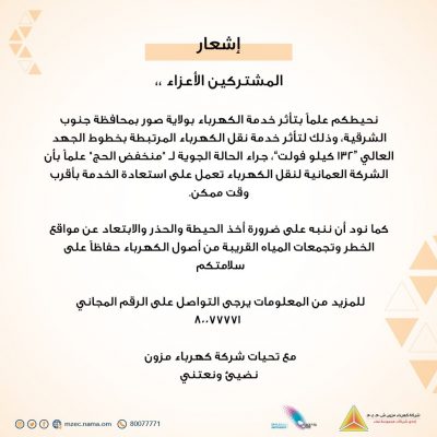 كهرباء مزون تصدر إشعاراً لمشتركيها الكرام حول تأثر خدمة الكهرباء بولاية صور بمحافظة جنوب الشرقية جراء المنخفض الجوي
