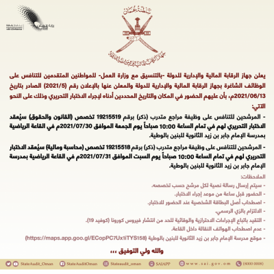 أعلن جهاز الرقابة المالية والإدارية للدولة بالتنسيق مع وزارة العمل- للمواطنين المتقدمين للتنافس على الوظائف الشاغرة بالجهاز، بأن عليهم الحضور في المكان والتاريخ المحددين لإجراء الاختبار التحريري.