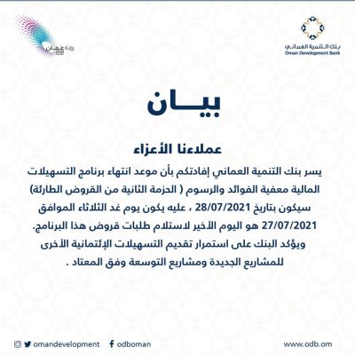 أصدر بنك التنمية العماني ، عبر حسابه الرسمي في توتير ، بيانًا قال فيه :