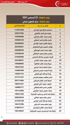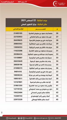 تعلن وزارة الصحة بالتنسيق مع وزارة العمل للمواطنين المبينه أسمائهم فيما بعد والذين سبق لهم وان تقدموا بطلباتهم لشغل وظيفة ممرض عام أ – ممرض عام المقرونه بالتدريب والشاغرة بمختلف المؤسسات الصحية التابعة لهذه الوزارة عليهم الحضور حسب التاريخ والتوقيت المحددين بالإعلان: